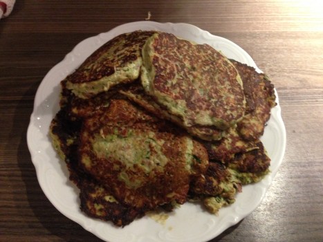 Bei Kartoffelpuffern lässt sich der Kohlenhydratanteil gewaltig reduzieren, wenn man einen Großteil der Kartoffeln durch geriebene Zuchini ersetzt. Dieses Mal habe ich auch etwas gebratenes Hackfleisch unter den Teig gemengt.
