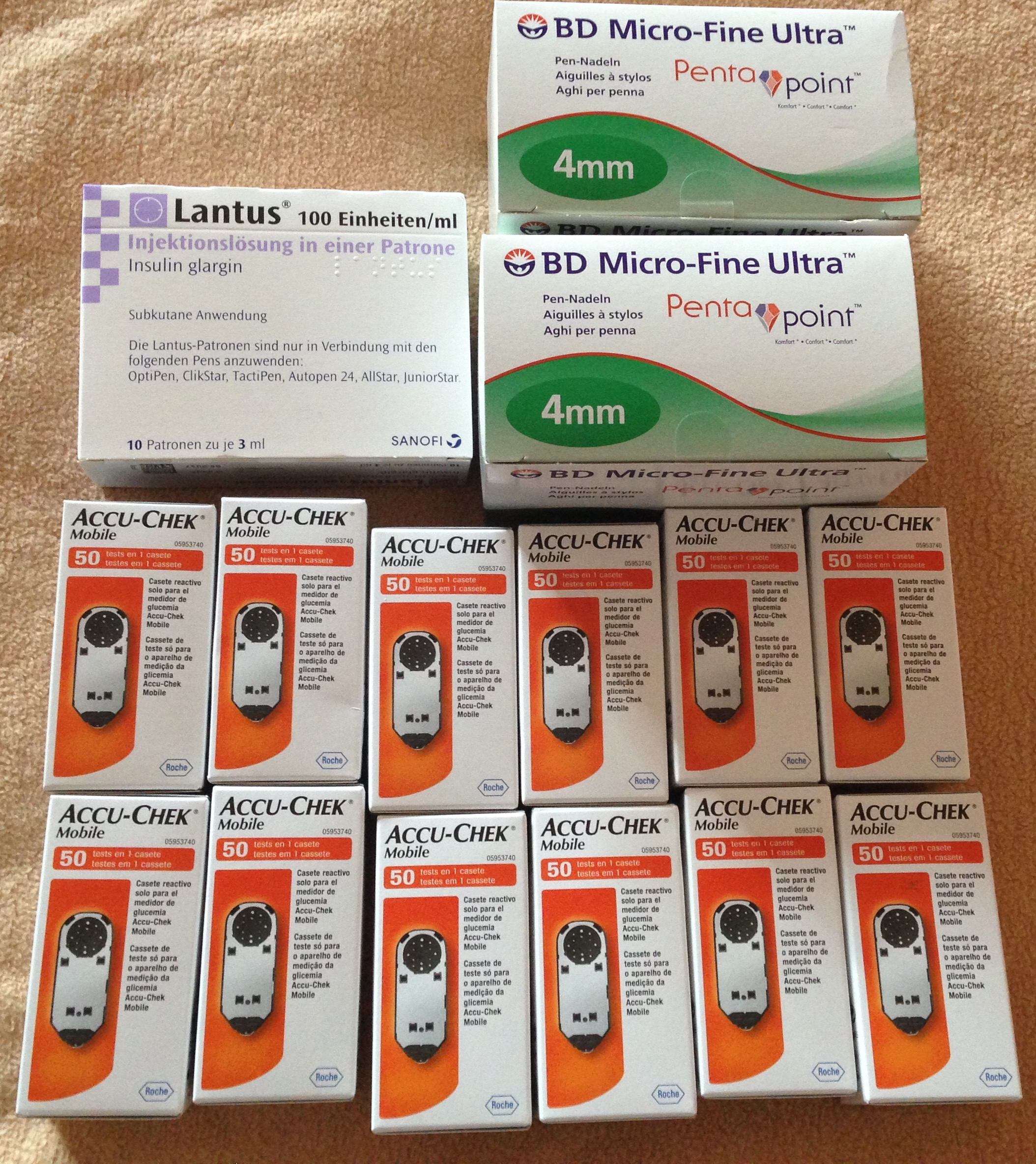 Ich möchte nun nicht behaupten, dass im hiesigen System der gesetzlichen Krankenversicherung immer alles mit rechten und gerechten Dingen zugeht. Aber Hand auf’s Herz: Es geht uns hierzulande trotz alledem wirklich verdammt gut! Heute habe ich mir nach einer Online-Rezeptbestellung in meiner Dia-Praxis Rezepte für meinen Quartalsbedarf an Diabetesutensilien abgeholt. Ich musste nicht warten, meine Rezepte waren fertig und bereits unterschrieben. In der Apotheke gegenüber von der Dia-Praxis ist man auf Kunden mit Diabetes eingestellt, es ist deshalb immer alles vorrätig, was ich für ein Quartal benötige. Ein einziges Mal bislang habe ich erlebt, dass nicht alle rezeptierten Cassetten mit Teststreifen vorrätig waren, die fehlenden Packungen bekam ich dann aber am Nachmittag kostenfrei von der Apotheke nach Hause geliefert. Ich bekam heute also meine 12 Cassetten für das Accu-Chek Mobile, mit denen ich bis Quartalsende 600 mal meinen Blutzucker testen kann. Ich bekam 200 Pennadeln, damit ich mehrmals täglich die Nadeln an meinen Insulinpens wechseln kann (wäre ich tatsächlich so konsequent, nach JEDER Injektion die Nadel zu wechseln, könnte ich mir auch 100 oder 200 Nadeln zusätzlich verschreiben lassen). Der Vorrat meines Balalinsulins Lantus war beinahe aufgebraucht, ich bekam 10 neue Ampullen. Von meinem Bolusinsulin Liprolog lagern noch etliche Ampullen in unserem Kühlschrank, hierfür brauchte ich kein neues Rezept.