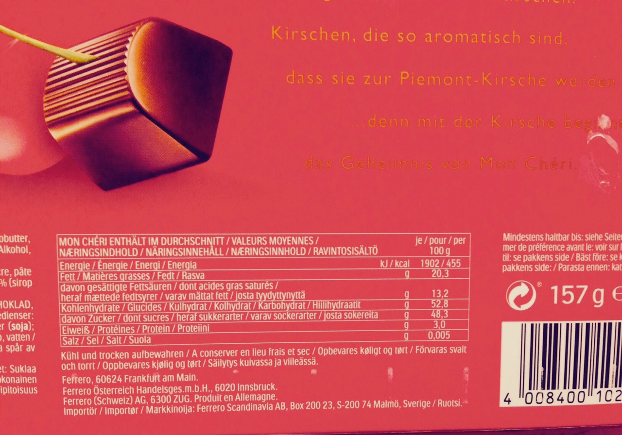 Im Jedermann-Markt in Lemgo-Brake – vermutlich ist das heute ein Edeka-Markt – konnte man an der Kasse Mon chéri einzeln kaufen, für 35 Pfennig das Stück. Und auch Elfjährige wurden nicht nach dem Alter gefragt, obwohl Mon chéri doch einen ganz ordentlichen Schluck Alkohol enthält. Ich bin also recht früh auf den Geschmack der Piemont-Kirsche gekommen. Es wurde unser gemeinsames heimliches Ritual: Jeden Montag nach dem Flötenkreis ein Mon chéri beim Jedermann-Markt. „Mon chéri, nicht irgendwas zum Naschen – wer kann da schon Nein sagen?“ war seinerzeit die Botschaft der Marke im Werbefernsehen.