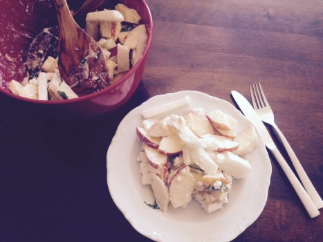 Heute sollte es mittags (wieder einmal) schnell gehen, außerdem hatte ich angesichts der tropischen Temperaturen keine Lust auf eine warme Mahlzeit. Also fix etwas Leckeres ausgedacht: ein Salat aus Kohlrabi, Apfel und Feta mit Joghurt-Dressing.