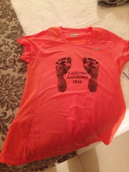 Am Flughafen bekamen wir alle unsere Laufbeutel mit Trainingsplan für die kommenden 10 Tage, einem sehr coolen Laufshirt (sehr diabetikerfreundlich, da mit Reißverschlusstäschchen, in dem das Libre-Lesegerät Platz findet!) und weiteren Infos. Mich überraschte eine unserer Trainerinnen mit Geburtstagsgeschenken von Seiten des Laufwerks: Ein Kosmetikbeutel mit Laufsocken, Schirmmütze, Kompass (woher wussten die von meinem schlechten Orientierungssinn??) und Geburtstagskerze. Wow – da hatte aber jemand die Teilnehmerliste genau studiert und bemerkt, dass ich genau heute ein Jahr älter geworden bin! Im Transferbus vom Flughafen in Jerez gab es noch einen Blumenstrauß obendrauf – und noch mehr Glückwünsche von allen anderen Reiseteilnehmern. Ich finde, das war ein gelungener erster Tag – und bin gespannt auf das erste Training morgen früh vor dem Frühstück.