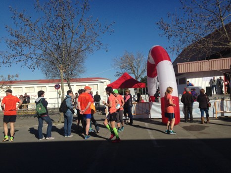 Wir mussten uns allerdings schon zu nachtschlafender Zeit (um 7:15 Uhr…) zum Frühstück versammeln, damit wir pünktlich um 8:00 Uhr in den eigens gecharterten Busklettern konnten, der uns ins etwa 30 Kilometer entfernte malerische Bergörtchen Medina Sidonia bringen sollte. Mit typisch deutscher Pünktlichkeit waren wir dann um kurz vor neun auch die allerersten Läufer im Startbereich. Das Zieltor stand bereits, die Techniker installierten gerade die Matten für die Zeitmessung und testeten die Soundanlage. Ansonsten war noch nicht viel los – Kunststück, der Lauf sollte ja auch erst um 10:30 Uhr starten. Als sich die Szene langsam füllte, fiel unsere 27-köpfige Truppe mit ihren orangefarbenen Laufshirts und Starterbeuteln vom Laufwerk unter den insgesamt 175 Startern ziemlich auf.