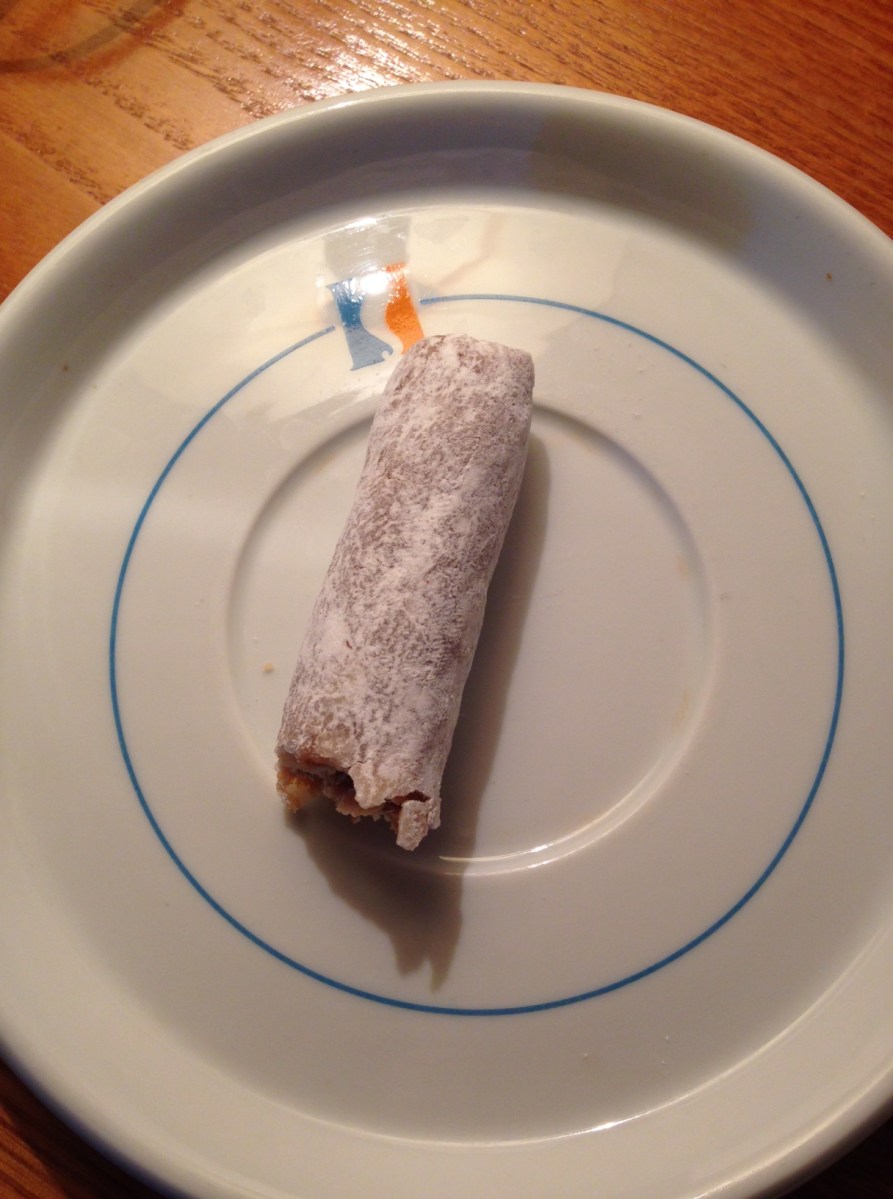 Fundstück im Starterbeutel: Was aussieht wie eine Salami mit Edelschimmel, ist ein sehr gehaltvoller Hypohelfer aus Trockenfrüchten, Honig und Mehl – gewälzt in Puderzucker. Das hilft, wenn der Muskelauffülleffekt einsetzt und nach dem Lauf der Zucker weiter sinkt…