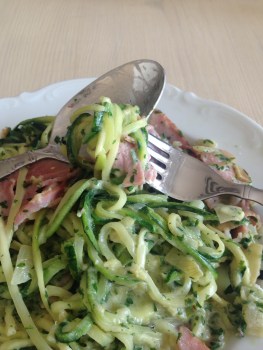 Die Zudeln beiseite stellen und die Carbonara-Sauce vorbereiten. Dafür kleingehackte Zwiebeln in etwas Olivenöl anbraten. (Wer morgen nicht zum Zahnarzt muss, kann auch eine zerdrückte Knoblauchzehe dazugeben). Serrano-Schinken in kleine Fetzen rupfen und dazugeben. Mit Sahne übergießen und ein wenig köcheln lassen. Damit die Sauce ein bisschen sämiger wird, ca. ½ Teelöffel Johannisbrotkernmehl dazugeben und einrühren. Salzen, pfeffern, mit Petersilie würzen und dann die Zudeln hinzufügen. Die Zuchinistreifen garen sehr schnell und sollen am Ende noch bissfest sein, daher müssen sie nur wenige Minuten mitgaren. Alles umrühren und auf einem Teller anrichten. Mit etwas geriebenem Käse bestreuen, fertig!