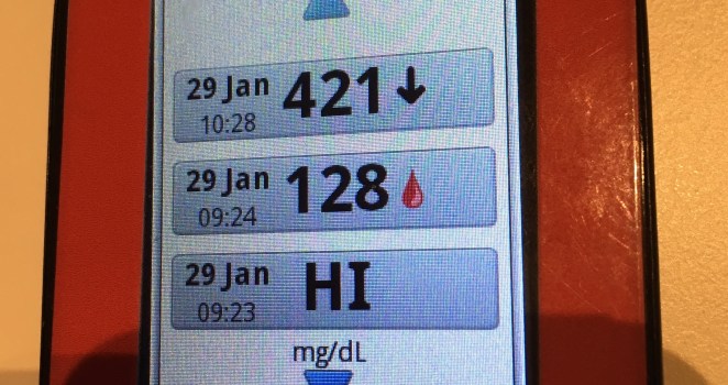 Gestern gab es wieder Probleme, abermals nach dem Duschen und Frühstücken. Erst die Fehlermeldung: „Glukosewert nicht verfügbar, bitte Messung in 10 Minuten wiederholen.“ Eine Weile später dann zeigte der Sensor aus unerfindlichen Gründen „HI“ an und erschrak gehörig – denn einen Messwert jenseits der 500 mg/dl habe ich (toi toi toi) in meiner gesamten Diabeteskarriere noch nicht gehabt. Die blutige Messung ergab zum Glück 128 mg/dl und passte auch zu meinem Gefühl und dem, was ich zuvor gegessen und gespritzt hatte. Wieder dauerte es ein paar Stunden – teils mit abgerissener Verlaufslinie der Messwerte – bis sich der Sensor wieder gerappelt hatte und plausible Werte anzeigt.