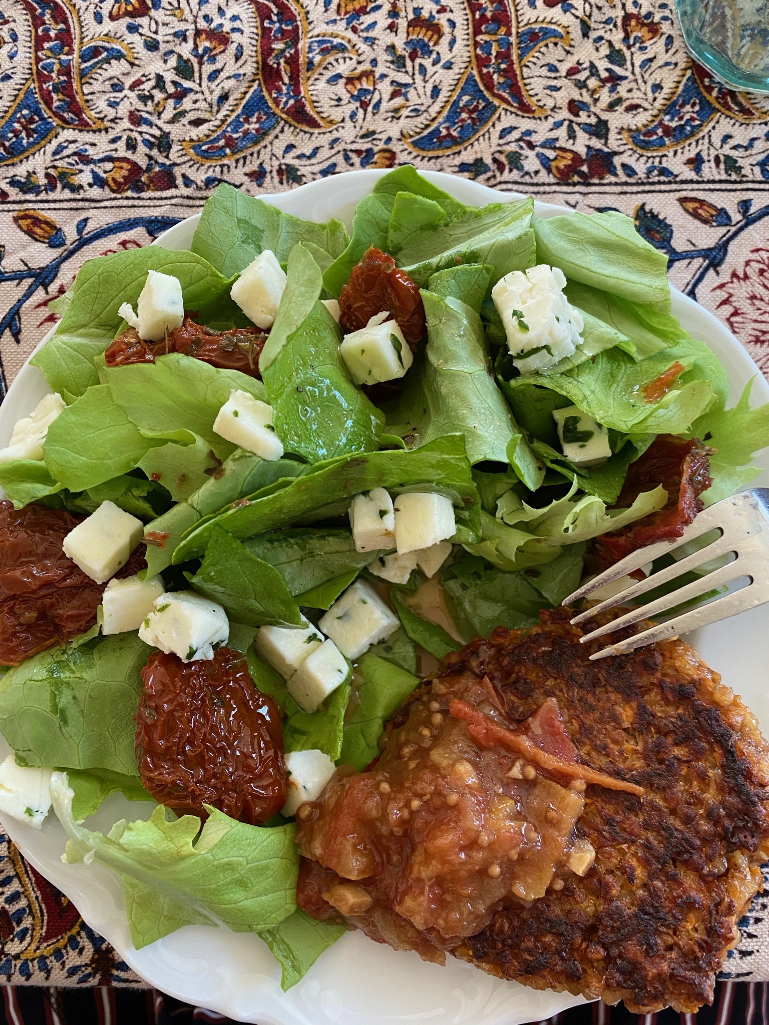 Meine Buchweizen-Frikadellen hatten eine sehr gute Konsistenz, hielten beim Braten gut zusammen, gaben sich dabei mit verhältnismäßig wenig Öl zufrieden und benahmen sich ähnlich wie konventionelle Frikadellen aus Hackfleisch. Wir haben sie zusammen mit einem grünen Salat mit getrockneten Tomaten in Öl sowie Salatkäse gegessen, dazu gab es einen Klecks selbstgemachtes Chutney, dessen Geschichte ich hier einmal aufgeschrieben hatte. Sie schmeckten so lecker, dass Christohp sich gleich in seiner App Yazio ein Rezept dafür angelegt hat. Yazio spuckt einem gleich auch die Nährwertangaben aus, sodass ich euch auch detaillierte Angaben dazu machen kann, die über die enthaltenen Kohlenhydrate (eine Frikadelle schlägt mit 2 KE zu Buche) hinausgehen: