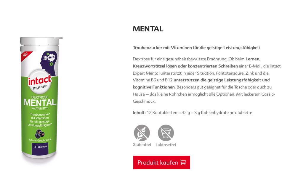 Das Konzept von intact Expert ‚Multi‘ und ‚Mental‘ erinnert mich auf ungute Weise sehr an die unsägliche Kampagne von Dextro Energy vor ein paar Jahren. Die Firma wollte mit ihrem Produkt ‚Schulstoff‘ (Mini-Traubenzuckerplättchen in einer kleinen Faltschachtel) Eltern unbedingt davon überzeugen, dass Schulkinder im Verlauf eines Schultags unbedingt mehrfach Traubenzucker einwerfen sollten, damit sie sich gut konzentrieren und lernen können. Es gab sogar eine konkrete Empfehlung für die Mengen, die Schulkinder im Verlauf eines Schultages zu sich nehmen sollten, damit ihr Gehirn dem Unterricht konzentriert folgen kann. Leider habe ich seinerzeit keine Screenshots gemacht, denn als bei der Markteinführung der große Shitstorm losging, hatte ich dieses Blog noch nicht. Ich habe mich nur auf meinem privaten Facebook-Account darüber aufgeregt: