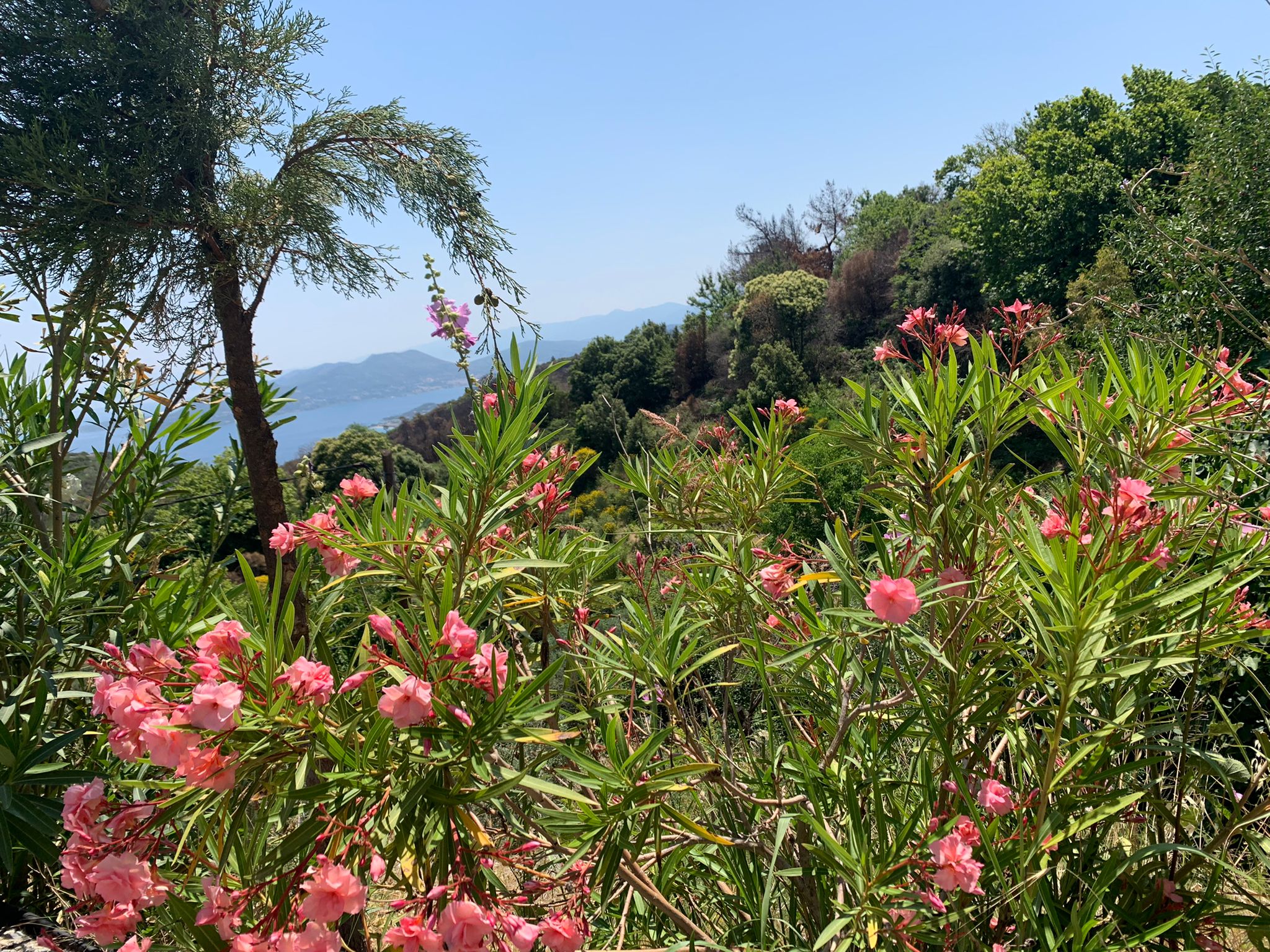 Bis dato hatte ich von den griechischen Inseln lediglich Kreta und Zypern kennen gelernt. Das kleine, an der engsten Stelle nur 1,2 Kilometer von der türkischen Küste entfernte Samos war mir noch gänzlich unbekannt. Gut, dass ich das nun nachgeholt habe! Denn ich kann mir nicht vorstellen, wie man sich nicht in dieses tolle Fleckchen Erde verlieben kann. An jeder Ecke wächst wilder Oleander in kräftigem oder zartem Rosa, Oliven-, Feigen- oder Maulbeerbäume. Von der Küste mit ihren Kiesstränden und kristallklarem Wasser geht es auf überwiegend gerölligen Wegen gleich hoch in die Berge, die über weite Strecken üppig bewaldet sind. In die Berge geschmiegt, findet man schnuckelige Dörfer mit engen Gassen und tollem mediterranem Flair. Meist weht ein sanftes bis kräftiges Lüftchen, es duftet abwechselnd nach Rosmarin, Pinien, Lavendel, wilden Kräutern und Blumen – ich wünschte, man könnte diesen Geruch nach Süden und Urlaub in Flaschen abfüllen!
