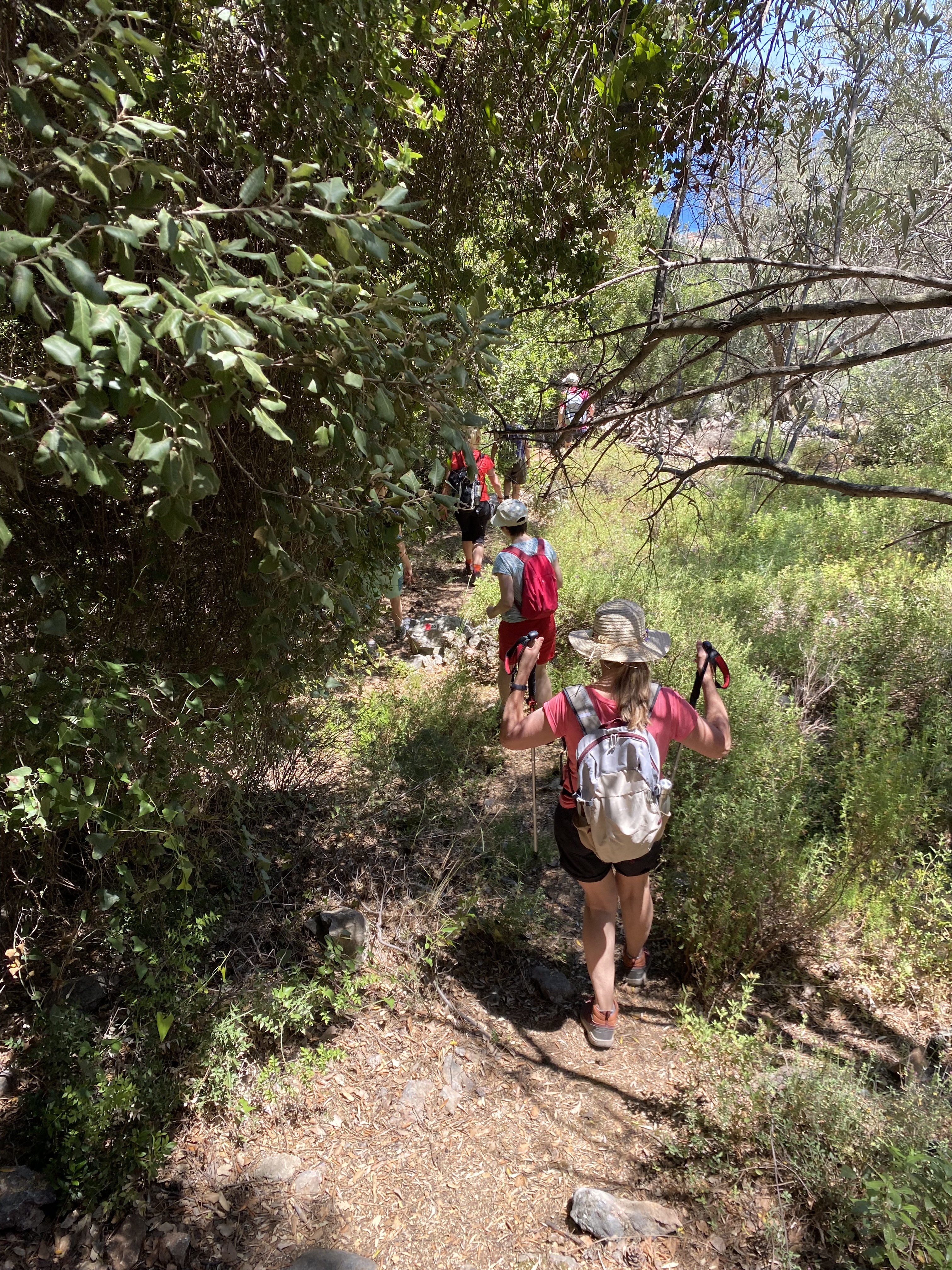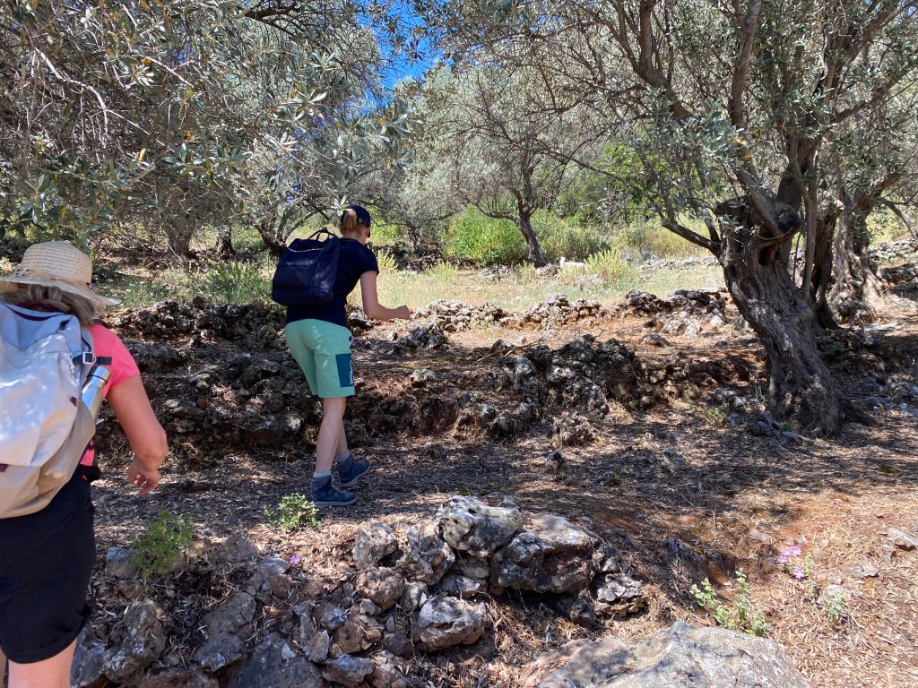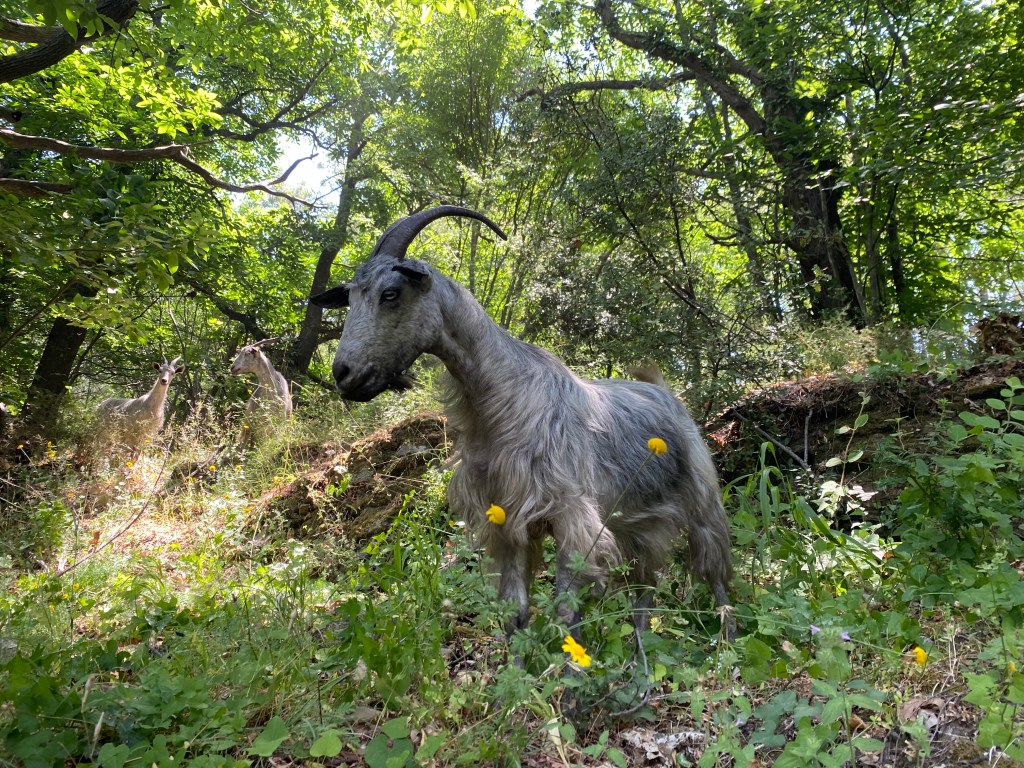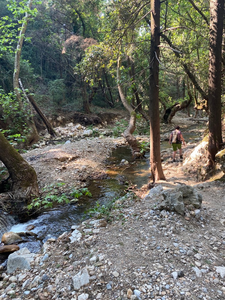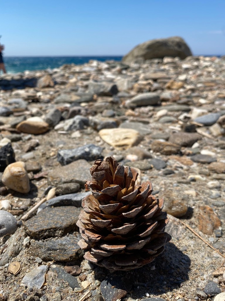 Wandertouren wie wir sie auf Samos unternommen haben, passen für mein Empfinden perfekt zu Yoga. Denn bei einem Anstieg spüre ich das Brennen meiner Muskeln und meinen beschleunigten Atem. Ich schaue nicht nach ganz oben, sondern fokussiere auf den nächsten Schritt. Ein Schritt nach dem anderen, im Hier und Jetzt. Geht es über einen Geröll-Weg steil bergab, muss ich mich auf meine Balance und Bodenhaftung konzentrieren. Da bleibt nicht viel Raum für andere Gedanken. Besonders schön fand ich es, wenn Marjan uns auftrug, eine bestimmte Etappe ganz in Stille zu gehen. Denn sonst passierte es halt doch immer wieder, dass man auf gerader Strecke nebeneinander ging und über den Job, die Chefin oder den letzten Urlaub nach Irgendwoanders plauderte. Was natürlich nett ist, weil man die Mitreisenden schließlich auch näher kennen lernen möchte. Aber gleichzeitig dazu führt, dass man eben nicht mehr im Hier und Jetzt ist, sondern gedanklich ganz woanders als bei der Wanderung. Bei diesen stillen Wander-Etappen gelang es mir, wirklich mit wachen Sinnen durch die Natur zu gehen und mich nicht ablenken zu lassen vom Duft nach Piniennadeln in der Nase, vom Knacken der Tannenzapfen auf dem Waldboden oder dem Geläut von im Unterholz versprengten Ziegen in meinen Ohren, vom Streicheln des Windes auf meiner verschwitzten Haut.
