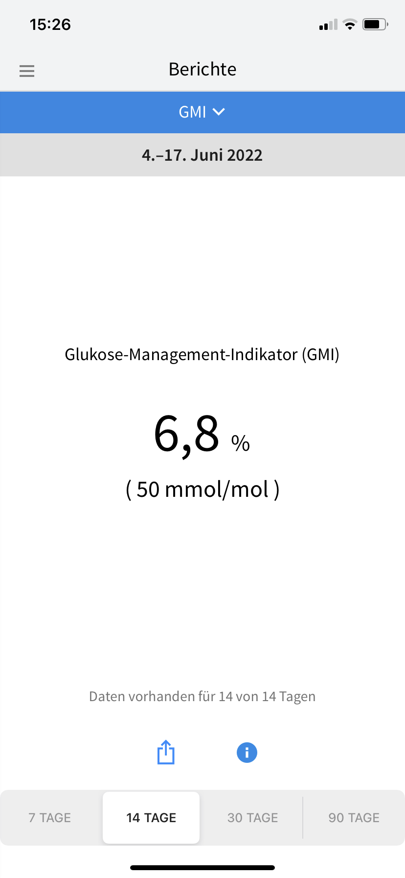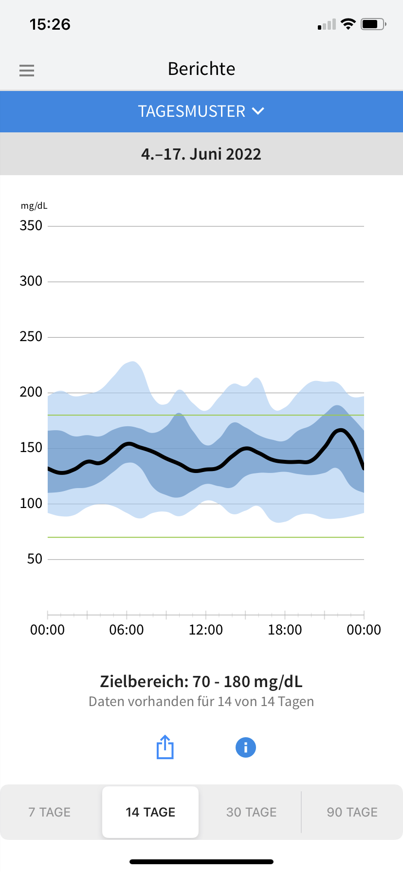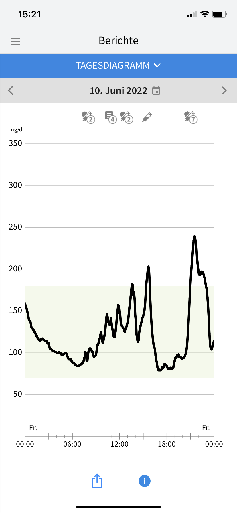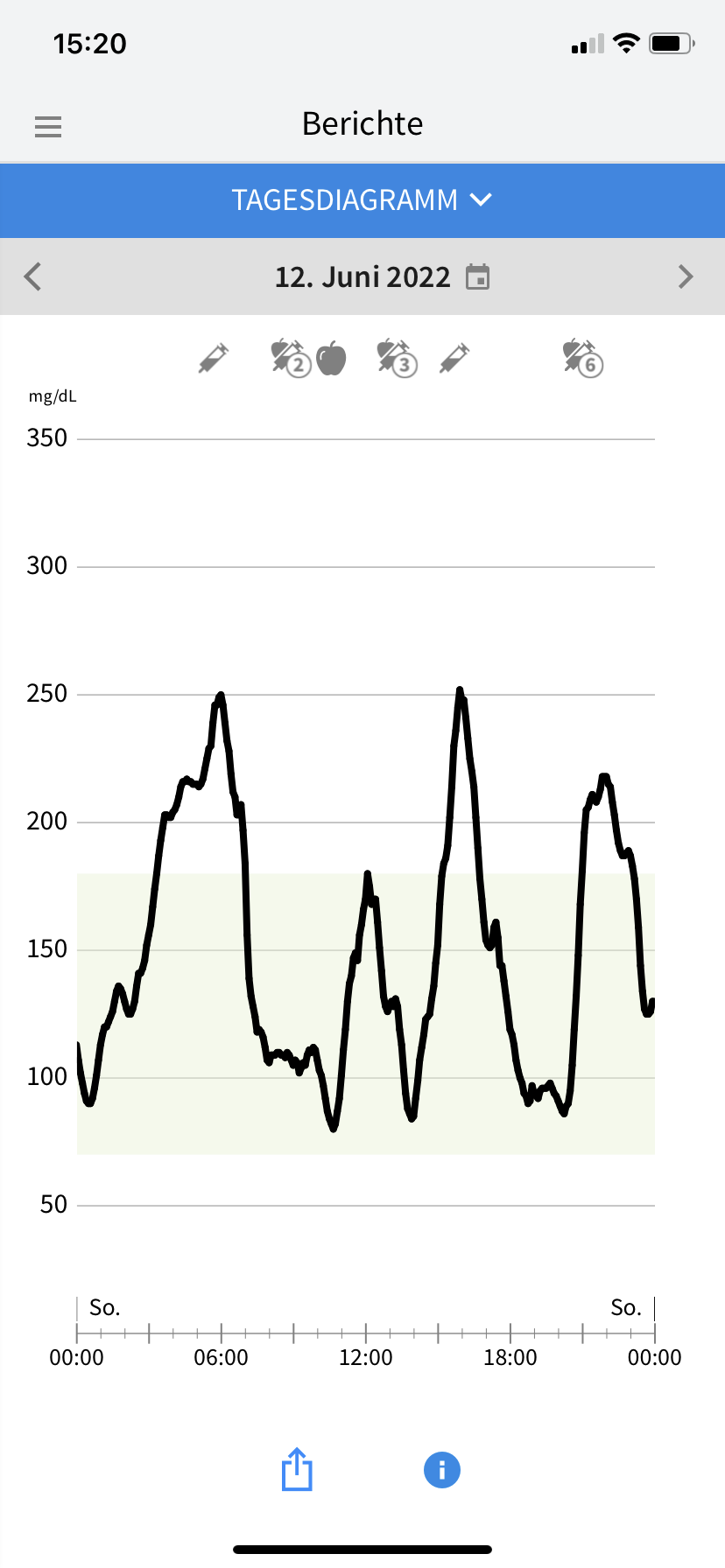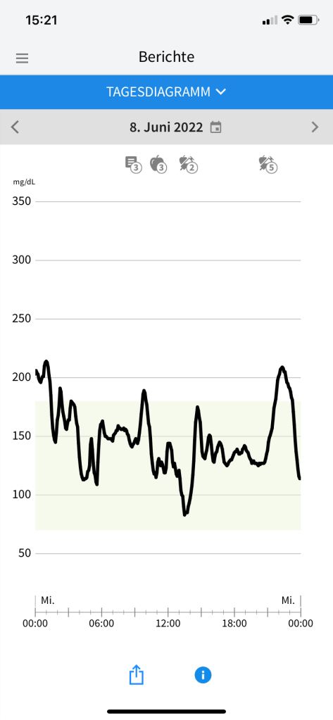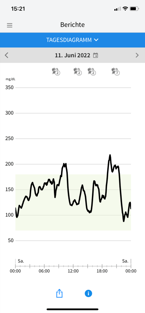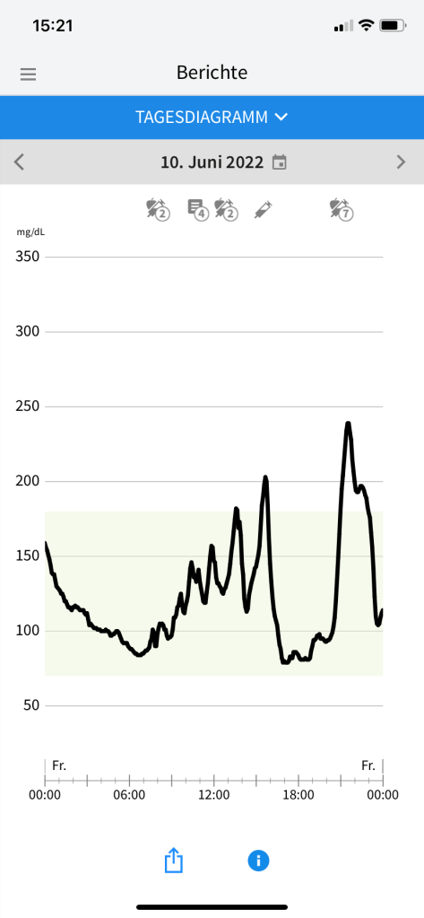 Die klitzekleinen Sorgen, die ich in Bezug auf das Aktivitätslevel und die Uhrzeiten gehabt hatte, waren zum Glück völlig unbegründet. Was eigentlich auch nicht verwunderlich war, denn ich habe ja schon desöfteren festgestellt, dass es meinem Diabetes am liebsten wäre, würde ich auf Gärtnerin, Möbelpackerin oder irgendeinen beliebigen Beruf umschulen, bei dem man permanent in Bewegung ist. Auf Samos umfasste das Aktivitätspensum 75 Minuten Yoga vor dem Frühstück, gefolgt von 3–4 Stunden Wandern (meist mit einer Mittagspause in einer Taverne in einem der kleinen Bergdörfer) und noch einmal 90 Minunten Yoga am Spätnachmittag. Da ich bislang immer recht gut damit gefahren bin, meine Basalrate auch bei viel Bewegung nicht anzutasten, spritzte ich auch während des Urlaubs weiter jeden Abend meine gewohnten 14 Einheiten Lantus. Beim Wandern bewährte es sich, nur etwas mehr als die Hälfte des gewohnten Frühstücksbolus zu spritzen (also 4 statt üblicherweise 7 Einheiten Lyumjev für 70 Gramm Kohlenhydrate). Damit stieg mein Glukosewert zum Beginn der Wanderung zwar auf ca. 200 mg/dl, sank aber infolge der Bewegung und des noch aktiven Insulins rasch wieder ab. Ich brauchte bei allen Wanderungen dann im Verlauf 4–5 Plättchen Traubenzucker (24–30 Gramm Kohlenhydrate), damit es kein gefährlicher Sinkflug wurde. Damit ich rechtzeitig Bescheid bekomme, erhöhte ich die Alarmgrenze bei meinem Freestyle Libre 3 auf 100 mg/dl (noch höher kann man sie nicht einstellen, für mich reicht ein Alarm bei 99 mg/dl aber völlig aus, denn ich habe dann noch genug Zeit zum Handeln – und meist habe ich sowieso mehrfach in der App nach dem Glukosewert geschaut, bevor das FSL3 überhaupt anfängt zu bimmeln). Beim Abendessen, zu dem es fast immer auch ein Gläschen Wein gab, spritzte ich ein bisschen weniger Insulin als sonst um diese Uhrzeit, reduzierte meinen Faktor also Pi mal Daumen von 1,25 auf 1,0. Allzu heftig fiel der Muskelauffülleffekt dann nicht aus, jedenfalls gab es keine nächtliche Unterzuckerung und überhaupt nur ein paar wenige vorsorgliche Alarme. Was die Optik der Kurven eher stört, sind die kurzzeitigen Ausreißer nach oben nach den Mahlzeiten. Die ließen sich aber kaum vermeiden, weil es beim Mittagessen in den Tavernen während unserer Wanderungen und auch beim Abendessen im Hotel bzw. auswärtigem Restaurant kaum möglich war, einen Spritz-Ess-Abstand einzuhalten. Und obwohl es mit der sehr gemüsereichen griechischen Küche leicht möglich ist, sich kohlenhydratarm zu ernähren, konnte ich dem begleitenden Weißbrot doch nur schwer widerstehen. Aber ich kann mit ein paar Ausreißern gut leben, wenn meine Werte insgesamt zu 84% im Zielbereich liegen und Tagesmuster sowie Glukose Management Indikator (GMI) auch ganz passabel aussehen. Mein Diabetes-Fazit lautet also: Nur weil einem in der Diabetespraxis vermutlich davon abgeraten würde, direkt nach dem Frühstück und mit wirksamem Insulinbolus eine intensive Sporteinheit einzulegen, muss man sich nicht davon abhalten lassen, es trotzdem zu tun. Ich für meinen Teil frage vor solchen Aktionen gar nicht erst nach, sondern erzähle meinem Diadoc erst hinterher, wie es gelaufen ist. 🙂 Wer unerfahren oder unsicher in diesen Dingen ist, sollte sich aber bitte lieber beraten lassen, bevor es auf die Reise geht.