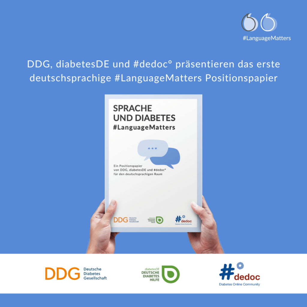 Dieses Positionspapier wird heute im Rahmen einer gemeinsamen Pressekonferenz von DiabetesDE und #dedoc im Vorfeld des Weltdiabetestags der Öffentlichkeit vorgestellt. Das Besondere daran ist: Es ist ein gemeinsames Papier von Menschen mit Diabetes, von DiabetesDE und von der Deutschen Diabetesgesellschaft (DDG). Erarbeitet wurde es im Wesentlichen von Autor*innen, die selbst mit Diabetes leben. Doch auch von den beiden großen Diabetes-Organisationen kamen noch viele wertvolle Impulse und Input. Nun zieren die Logos aller drei Gruppen das Papier – und stehen damit auch dafür, dass sich alle drei in ihrem jeweiligen Wirkungskreis für eine sensible und empathische Sprache mit und über Menschen mit Diabetes einsetzen wollen.