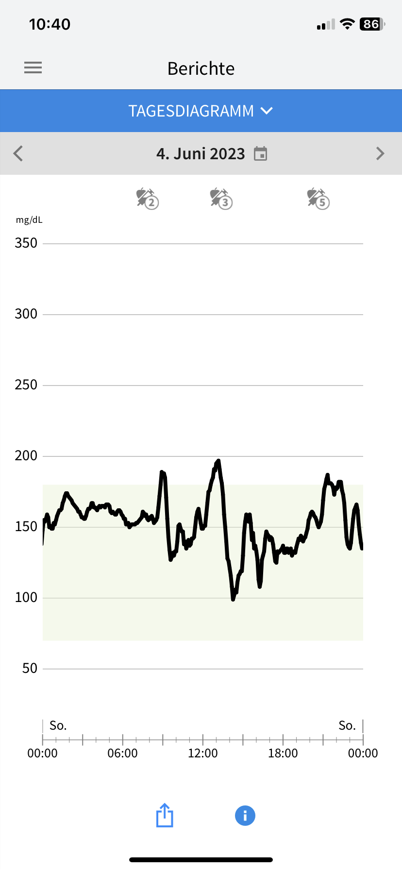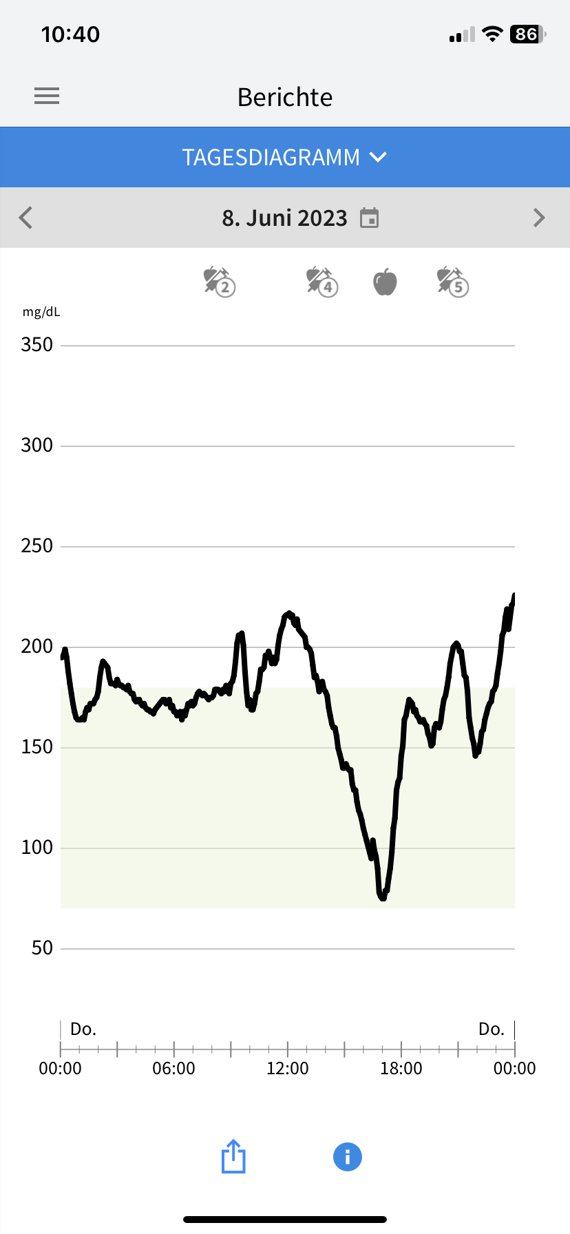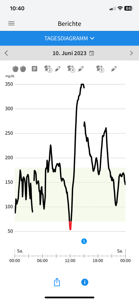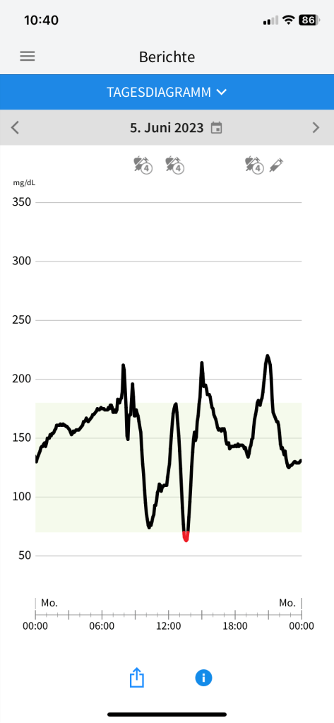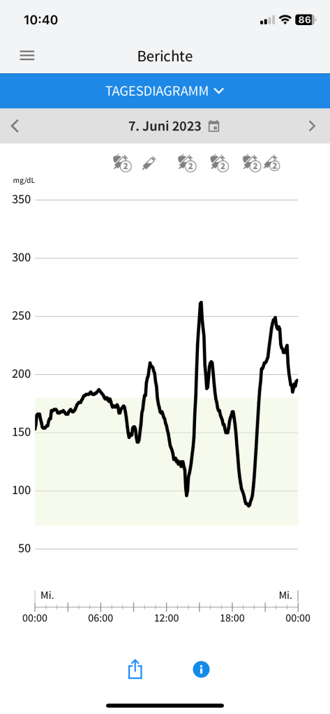 Diese Zucker-Booster konnte ich auch öfter mal gut gebrauchen. Denn dieses Jahr lag ich – anders als 2022 auf Samos – im Urlaub quasi im Dauer-Clinch mit meinem Diabetes. Eigentlich steht mein Diabetes ja total auf Bewegung jeglicher Art. Je mehr ich auf den Beinen bin, umso ausgeglichener sind meine Glukosekurven… normalerweise. Doch es ist natürlich eine gewisse Herausforderung, direkt nach dem Frühstück mit noch wirkendem Bolus zu einer mehrstündigen und schweißtreibenden Wanderung aufzubrechen. Vor allem, wenn man beim Frühstücksbüffet z. B. nicht an den typisch griechischen süßen Blätterteig-Teilchen vorbeigehen konnte, die aufgrund des hohen Fettanteils erst verzögert im Blut ankommen. Wo bereits das extraschnelle Insulin Lyumjev seine Wirkung entfaltet. Ich musste also desöfteren zu Beginn unserer Touren Zucker nachwerfen und mir dann im Verlauf ansehen, wie der Zucker dann gegen Mittag (hallo Blätterteig-Teilchen!) in die Höhe schoss. Soll man dann korrigieren und eine weitere Hypo riskieren? Oder den Zucker erstmal laufen lassen in der Hoffnung, dass er beim Wandern von allein wieder sinkt? Ich fand diese Entscheidungen nicht leicht und habe offensichtlich auch etliche Male die falsche getroffen, wie ihr an meinen Tagesprofilen im Laufe der Reise sehen könnt, die quasi von Tag zu Tag gruseliger wurden.