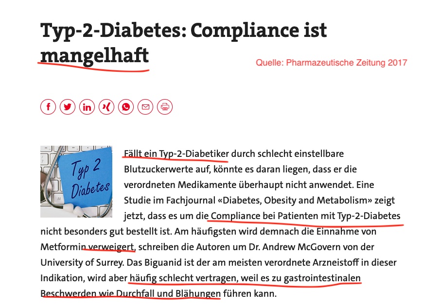 Leider sind die Fachmedien um keinen Deut besser, was das einseitige Framing von Menschen mit Diabetes angeht. Auch hier liegt der Fokus auf der individuellen Verantwortung für die eigene Gesundheit. Zudem herrscht mit dem durchgängig verwendeten Begriff der ‚Diabeteseinstellung‘ ein sehr maschinistisches Bild von Diabetestherapie vor: Ein Rädchen hier, ein Knöpfchen da drehen, und schon ist die Maschine wieder sauber eingestellt und läuft wie am Schnürchen. Schlimm ist auch, dass in vielen Fachartikeln die ‚Compliance‘ bzw. ‚Therapietreue‘ als Bewertungskriterium fungiert: Wer sich an ärztliche Anweisungen hält (Compliance), ist ein guter Diabetiker. Wer sich nicht daran hält – egal wie nachvollziehbar die individuellen Gründe hierfür sein mögen – ist ein schlechter Diabetiker. Bei dem Begriff der ‚Therapieverweigerung‘ schwingen natürlich jede Menge Vorwürfe mit: Wie kann es sein, dass Menschen so unvernünftig und kooperationsunwillig sind und im Umgang mit ihrer Gesundheit derart versagen? Ein besonders vergiftetes Beispiel für dieses sprachliche Framing habe ich vor einigen Jahren in der Pharmazeutischen Zeitung gefunden: