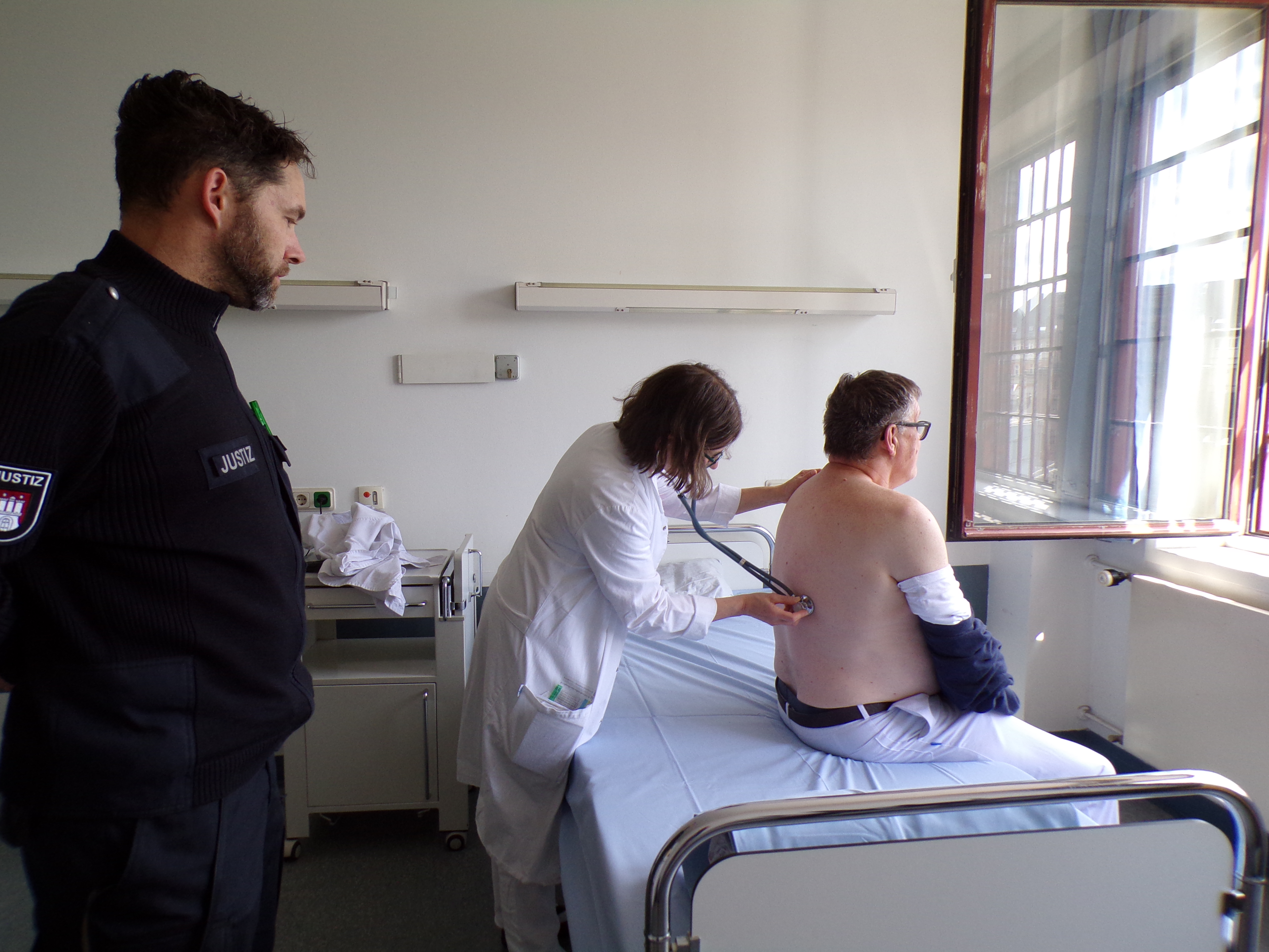 Das Hamburger Untersuchungsgefängnis ist ein respekteinflößender roter Backsteinbau. Die hohen Mauern und Zäune, die ihn umgeben, sind zusätzlich mit Nato-Draht gesichert. Im Innern dieser Festung gibt es ein Zentralkrankenhaus, in dem von Innerer Medizin über Augenheilkunde, Chirurgie und Zahnmedizin bis zur Radiologie nahezu alle ärztlichen Fachrichtungen vertreten sind. Hier können neben den Untersuchungsgefangenen auch Strafgefangene anderer Hamburger Justizvollzugsanstalten (JVA) behandelt werden. Eine Ambulanz, wie sie auch jede andere Haftanstalt vorhält, kümmert sich um die kontinuierliche medizinische Versorgung der Insassen. Hier war ich mit JVA-Bediensteten verabredet, die mir Einblick in ihre Arbeit gewähren wollen.