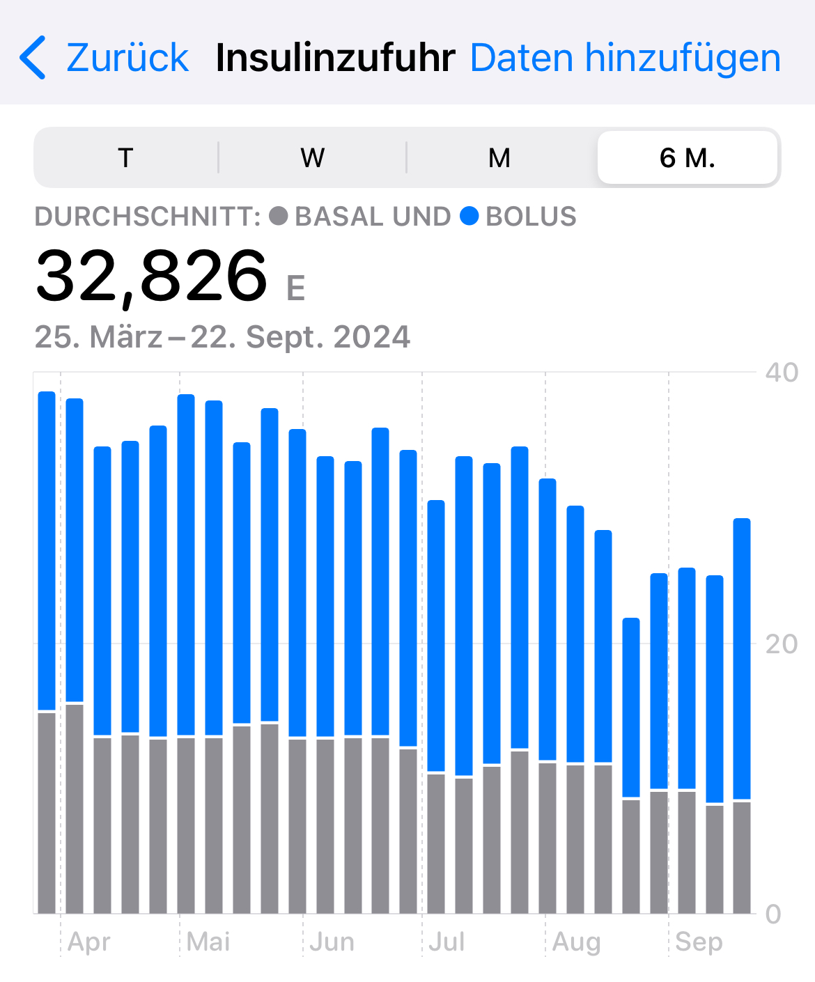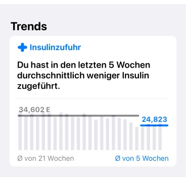 Ich machte allerdings noch eine weitere wichtige Beobachtung. Binnen kürzester Zeit, nachdem ich mit der HRT begonnen hatte, verbesserte sich meine Insulinempfindlichkeit deutlich. Das ist kein wirklich überraschender Effekt, denn umgekehrt weiß man ja, dass bei Frauen mit Beginn der Wechseljahre das Risko für einen Typ-2-Diabetes steigt, weil das Fehlen des Östrogens die Insulinempfindlichkeit verschlechtert. Ich musste mir zwar bislang glücklicherweise keine ernsten Gedanken über eine gefährliche Insulinresistenz machen. Aber mit dem Start der HRT hat sich mein Insulinverbrauch so stark verringert, dass es auch Apple Health direkt auffiel: „Es gibt Veränderungen bei deiner Insulinzufuhr“, teilte mir mein iPhone wenige Wochen später mit.