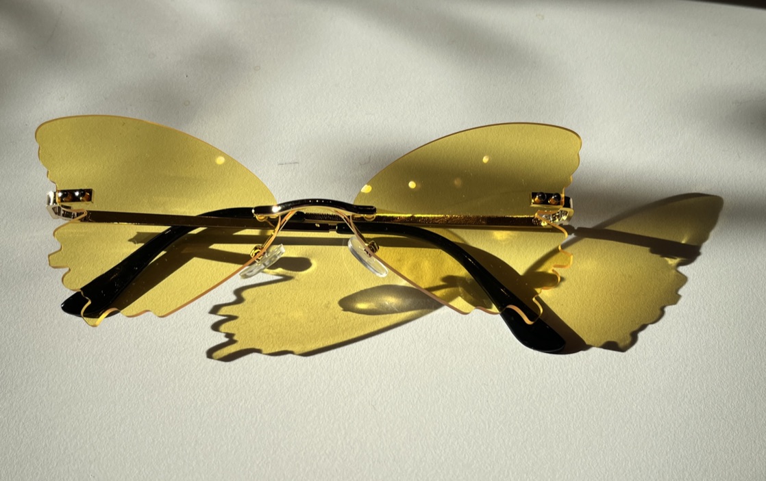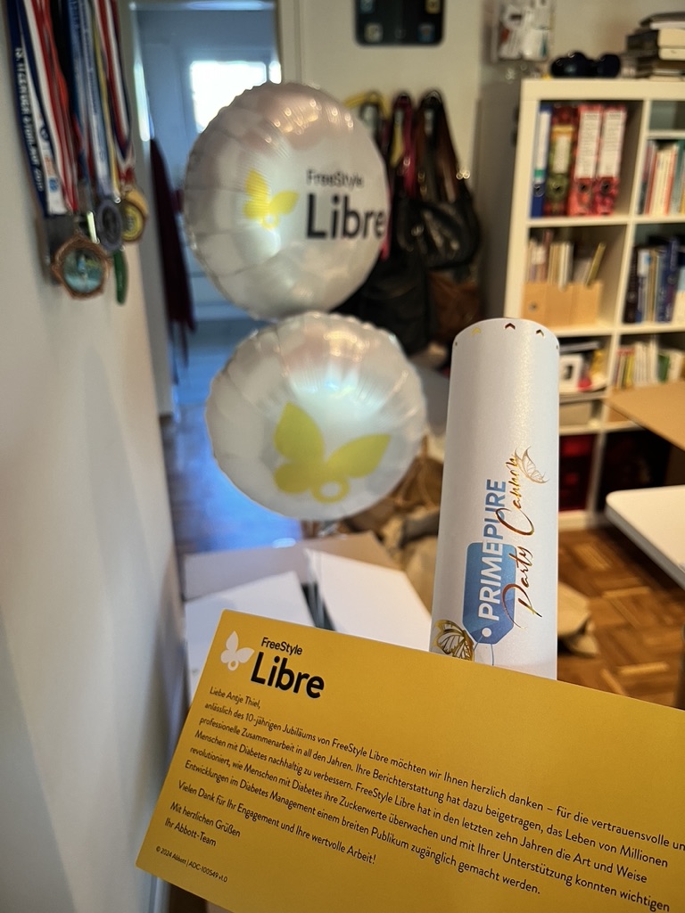 Tatsächlich wog der Karton überraschenderweise fast nichts. Und war nicht an Christoph, sondern an mich adressiert. Drin fand ich einen weiteren, etwas kleineren Karton. Und aus dem schwebten mir dann zwei Helium-Ballons mit Freestyle Libre-Aufdruck entgegen. Außerdem: eine gelbgetönte Brille mit Gläsern in Schmetterlingsform, eine Konfettibombe und eine Zeitleiste mit den wichtigsten Meilensteinen aus der nunmehr zehnjährigen Geschichte des Glukosesensors von Abbott. Wow.