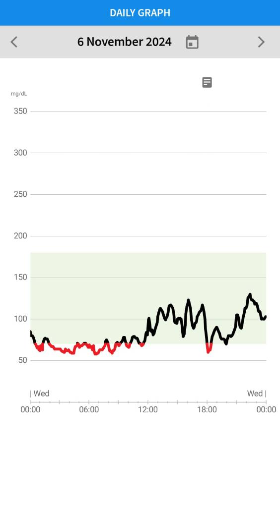 Mit diesem Vorwissen hatten Christoph und ich keine besonderen Erwartungen an seinen Testlauf mit dem FSL-Sensor. Ich war ein bisschen neugierig, ob die Kenntnis seiner Glukosewerte Christoph in irgendeiner Form in seiner Eigenwahrnehmung und seinem Verhalten beeinflussen würde. Und Christoph wollte herausfinden, ob er mithilfe seiner Glukosekurven sein Training für den nächsten Marathon (damals stand der Athen-Marathon im November 2024 kurz bevor) würde optimieren können. Abgesehen davon, dass Christoph offensichtlich keinen Diabetes hat, haben wir dann im Verlauf der 14 Tage tatsächlich zwei interessante Dinge gelernt, die wir vorher noch nicht wussten: