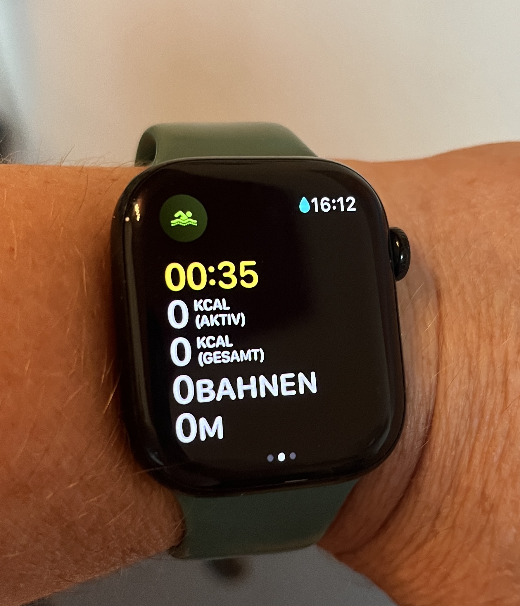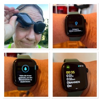 Aber damit nicht genug: Die Apple Watch hat die Eigenheit, beim Starten einer Schwimmaktivität einen sogenannten Wasserschutz zu aktivieren. Wenn diese Wassersperre aktiviert ist, reagiert die Uhr nicht auf Berührungen auf dem Display. Laut Apple sollen damit versehentliche Eingaben im Wasser verhindert werden. Wenn man die Wassersperre wieder deaktiviert, stößt die Watch dann Wasser aus, das im Lautsprecher verblieben ist. Ich habe ganz genau hingeschaut, aber noch nie Wasserfontänen aus den feinen Nähten am Uhrgehäuse sprühen gesehen. Wie auch immer – meine Glukosewerte kann ich mit aktivierter Wassersperre jedenfalls nicht sehen. Denn das einzige, was man beim Tippen auf das Display zu sehen bekommt, ist dann die laufende Aktivität. Die aktivierte Wassersperre erkennt man übrigens an dem kleinen Wassertropfen-Symbol links neben der Uhrzeit. Wenn man aus dieser Ansicht herauskommen möchte, muss man zunächst für eine Weile das Uhrrädchen (im Apple-Sprech Krone genannt) gedrückt halten. Dann erscheinen Wasserblasen auf dem Display, zusammen mit der Info, dass die Uhr nun Wasser ausstößt und dann entsperrt ist. All das braucht ein Weilchen Zeit und lässt sich definitiv nicht in den Bewegungsablauf beim Brustschwimmen einbauen.