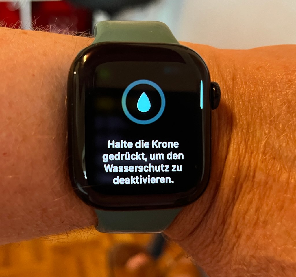 - Dann länger auf die Krone der Apple Watch drücken, um das Display zu entsperren und den Wasserschutz zu deaktivieren.