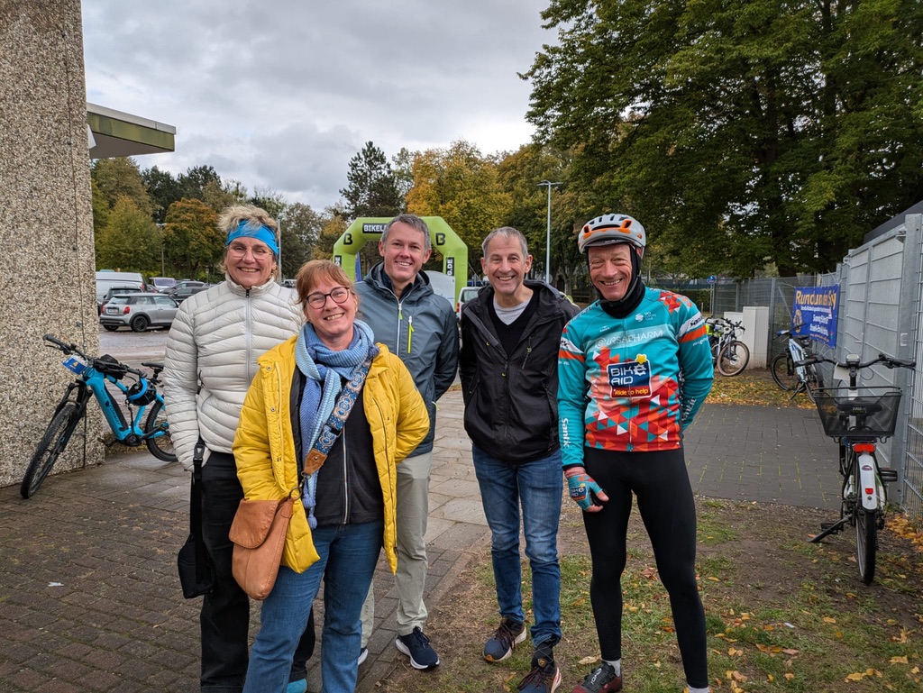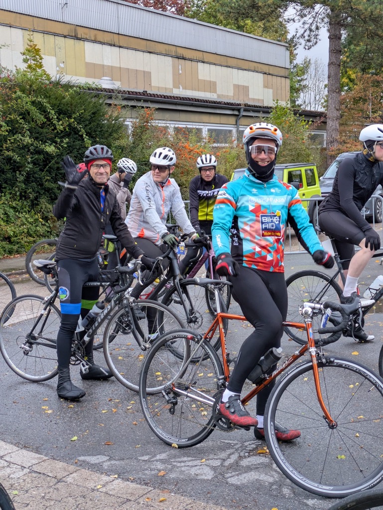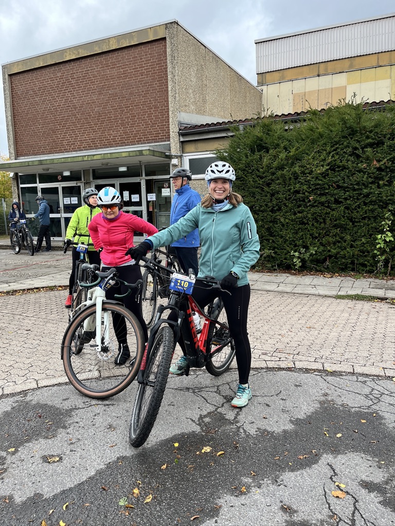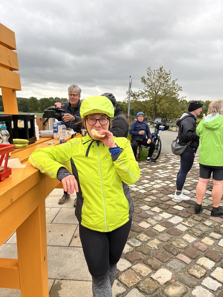 Unterwegs gab es eine Verpflegungsstation, wo wir mit belegten Brötchen, Getränken und Kuchen versorgt wurden. Ich hatte gar keinen Insulinpen dabei, konnte mir aber ein Brötchen einverleiben, ohne dass ich dafür Insulin gebraucht hätte. Blutzuckertechnisch haute die kleine Tour also ganz gut hin. Unterdessen froren sich die Rennradler bei weiterhin ungemütlichem Wetter Hände, Füße und sonstwas ab vollbrachten unsere Rennradler beeindruckende Höchstleistungen und kamen zum Glück auch alle heil ins Ziel. Am Ende konnten sich alle Teilnehmenden im Zielbereich in der Turnhalle stärken und sich für die Heimfahrt wieder frisch machen.