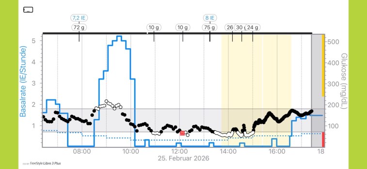 Ich hatte vor dem Frühstück nicht genug Spritz-Ess-Abstand (SEA) eingehalten. Normalerweise sollte ich morgens etwa 20 Minuten warten, bevor ich mit dem Essen beginne. Am 25. Februar klappte das allerdings nicht so gut. Und so stieg der Glukosewert zwangsläufig schneller an als an den Tagen zuvor, an denen mir die Sache mit dem SEA mustergültig gelungen war. Hätte ich da noch wie früher mit Insulinpens hantiert, wäre meine Reaktion ganz einfach gewesen: „Oh Mist, zu wenig SEA. Abwarten, der Zucker wird von allein wieder sinken, denn die Dosis stimmte ja.“ Zumindest zu Hause bin ich beim Frühstück ein ziemliches Gewohnheitstier und habe es mir außerdem zur Angewohnheit gemacht, Brot, Käse, Marmelade und Quark abzuwiegen und in meine Nährwert-App einzutragen. Meine Kohlenhydrateingaben sind also ziemlich exakt, Schätzfehler quasi ausgeschlossen.